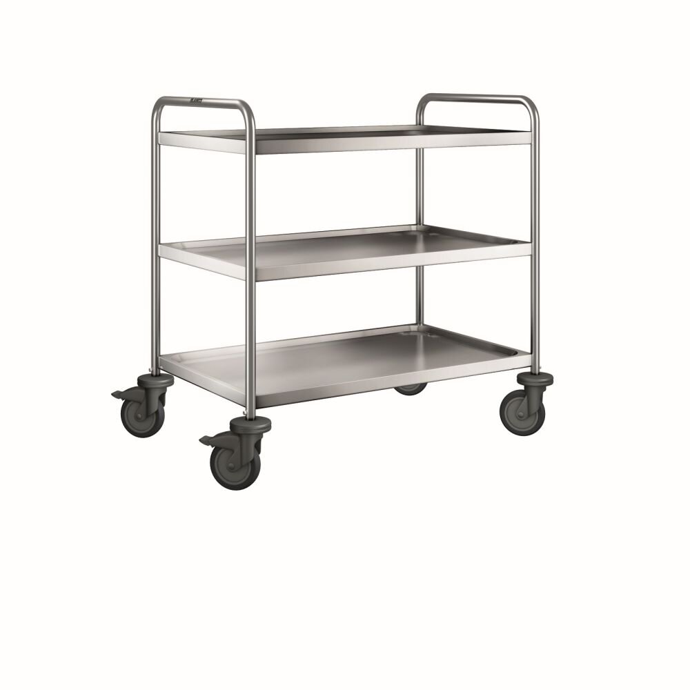 Servierwagen aus rostfreiem Edelstahl mit Kunststoffrollen Verschweißte Borde für maximale Stabilität Antidröhnmatte an jedem Bord zur Schallisolierung Leicht erhöhter Profilrand verhindert das Wegrutschen des Transportgutes Eingerollte Kanten helfen, Verletzungen zu vermeiden Wandabweiser/ Stoßschutz serienmäßig 4 Lenkrollen Ø 125 mm, davon 2 mit Feststeller Maße der Borde: 3 Borde 900 x 550 mm max. Belastung je Bord: 80 kg Lichtes Maß zwischen den Borden: 275 mm Tragfähigkeit: 120 kg