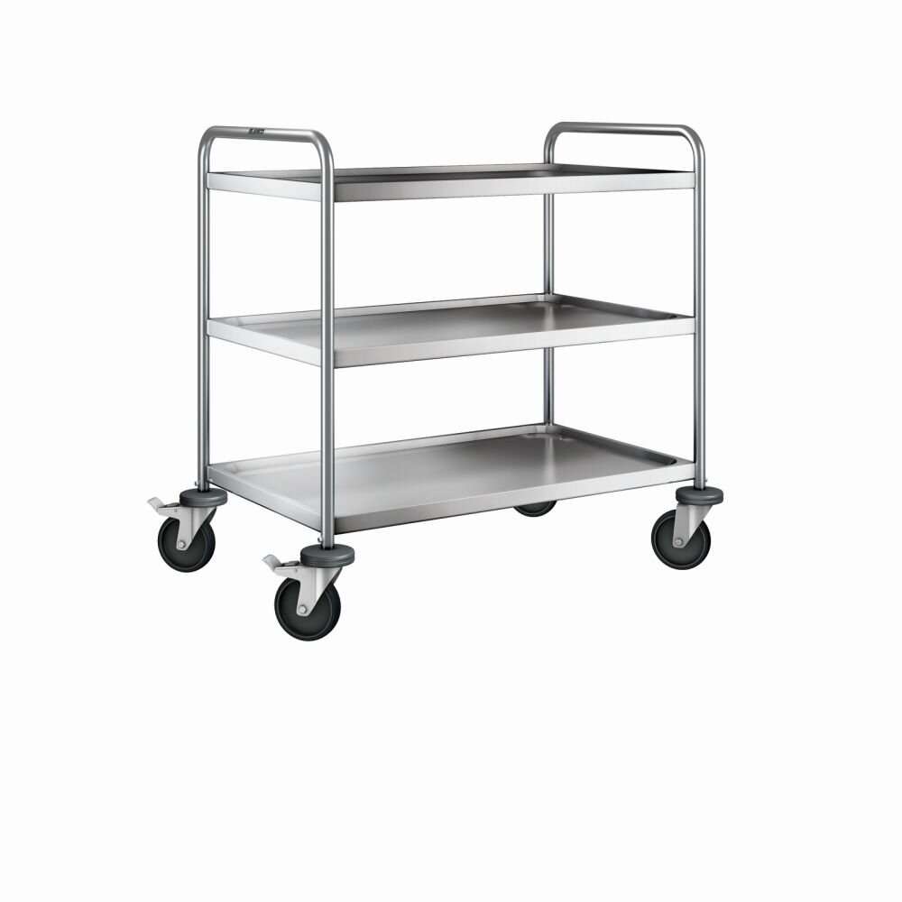 Servierwagen aus rostfreiem Edelstahl mit stahlverzinkten Rollen 4 Lenkrollen Ø 125 mm, davon 2 mit Feststeller Maße der Borde: 3 Borde 900 x 550 mm max. Belastung je Bord: 80 kg Lichtes Maß zwischen den Borden: 275 mm Tragfähigkeit: 120 kg