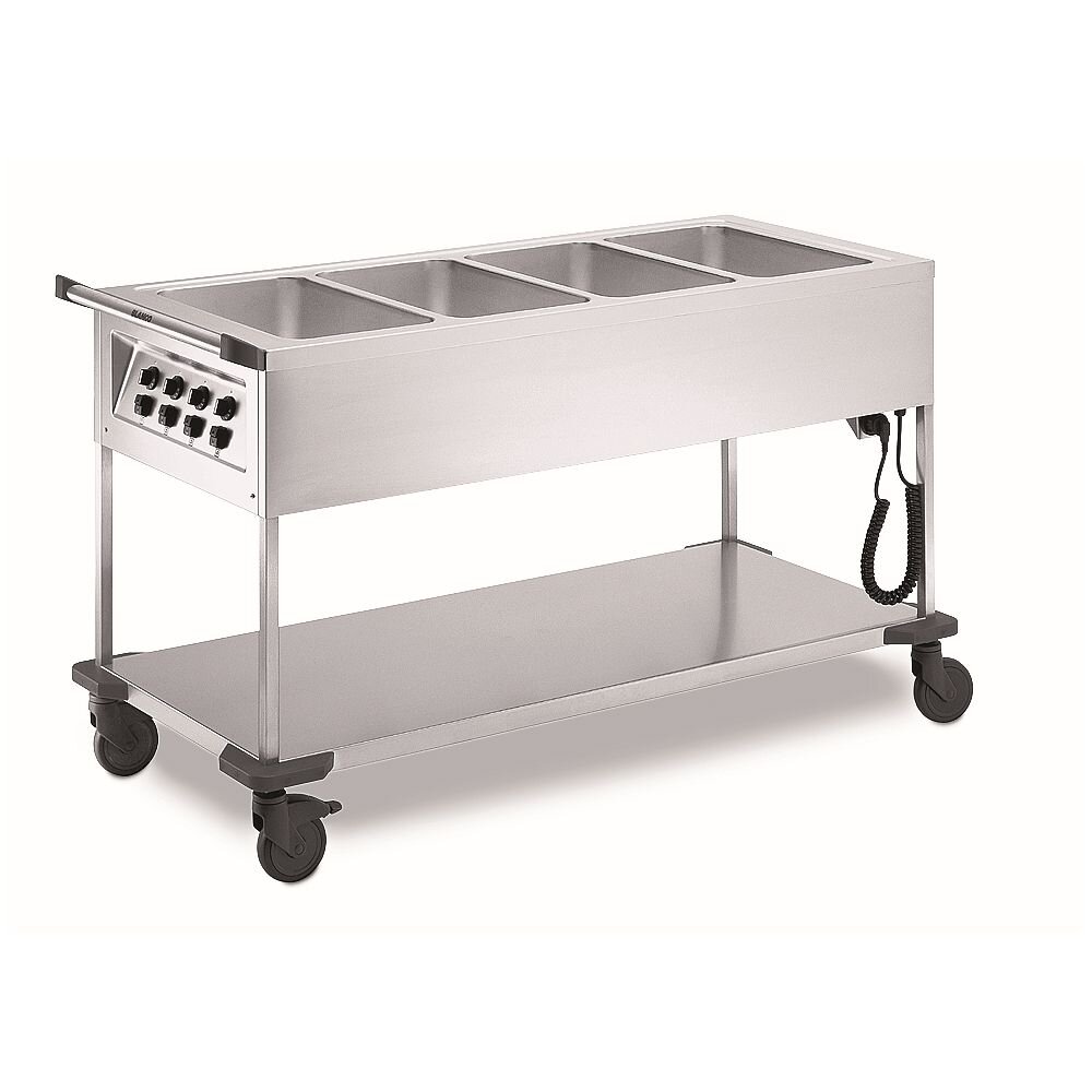 Speisenausgabewagen aus rostfreiem Edelstahl 4 Einzelbecken mit Temperaturregler, nass und trocken beheizbar, 4 Lenkrollen Ø 125 mm, davon 2 mit Feststeller Kapazität: 4 x GN 1/1-200 oder deren Unterteilung Becken separat regel- und beheizbar Arbeitshöhe: 900 mm