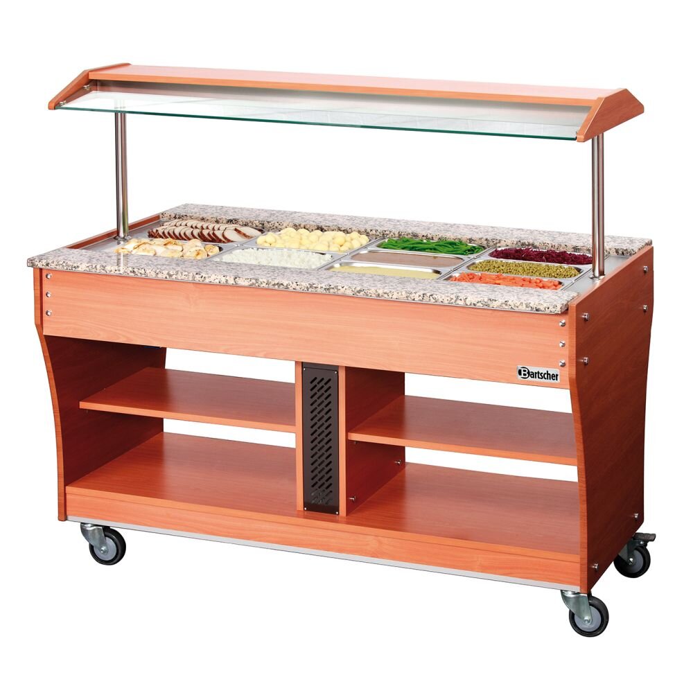 Buffetwagen, warm, 4x 1/1GN, T150 Buffetwagen, warm 4 x 1/1 GN, 150 mm tief Heiße Speisen“ perfekt präsentieren Die Heiße Theke ist mit der integrierten Beleuchtung, dem Hustenschutz mit Ablagefunktion und Rollen für bequeme Transportmöglichkeiten optimal ausgestattet. Wanne aus Edelstahl für 4 x 1/1 GN, 150 mm tief, mit Ablaufhahn Arbeitsplatte aus Granit Rosa Porrino Seitenwände und Korpus aus Holz, walnussfarben 4 Lenkrollem mit 2 Feststellern Hustenschutz, beleuchtet Temperaturbereich 30 °C bis 90 °C Anschlusswert: 3,0 kW / 230 V 50/60 Hz Maße: B 1490 x T 880 x H 1370 mm Einfache Montage! Vorbereitet für die beidseitige Anbringung der passenden Tablettrutsche, Bartscher Art.-Nr. 125503. Lieferung ohne GN-Behälter! (Zubehör siehe Gastronorm-Behälter) „