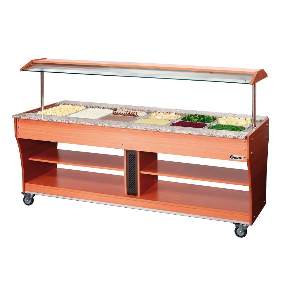 Buffetwagen, warm, 6x 1/1GN, T150 Vorbereitet für die beidseitige Anbringung der passenden Tablettrutsche, Bartscher Art.-Nr. 125504. Heiße Speisen“ perfekt präsentieren Die Heiße Theke ist mit der integrierten Beleuchtung, dem Hustenschutz mit Ablagefunktion und Rollen für bequeme Transportmöglichkeiten optimal ausgestattet. 2 Wannen aus Edelstahl á 3/1 GN, 150 mm tief, mit Ablaufhahn Arbeitsplatte aus Granit Rosa Porrino Seitenwände und Korpus aus Holz, walnussfarben 4 Lenkrollem mit 2 Feststellern Hustenschutz, beleuchtet Temperaturbereich 30 °C bis 90 °C Anschlusswert: 2 x 2 kW / 230 V 2 getrennte Steckdosen erforderlich Maße: B 2150 x T 880 x H 1370 mm Einfache Montage! Lieferung ohne GN-Behälter! (Zubehör siehe Gastronorm-Behälter) „