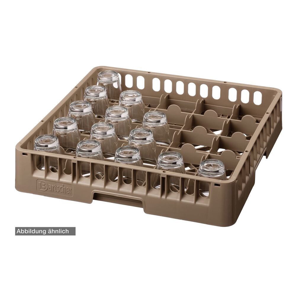 Gläserkorb, 25 Fächer Die stapelbaren Spülmaschinenkörbe von Bartscher sorgen für gute Spülergebnisse, gutes Korbhandling und für eine saubere und sichere Aufbewahrung. Stapelbar 25 Fächer Fachgröße: 89 x 89 mm Korbgröße: 500 x 500 mm Gesamthöhe: 306 mm Innenhöhe: 285 mm