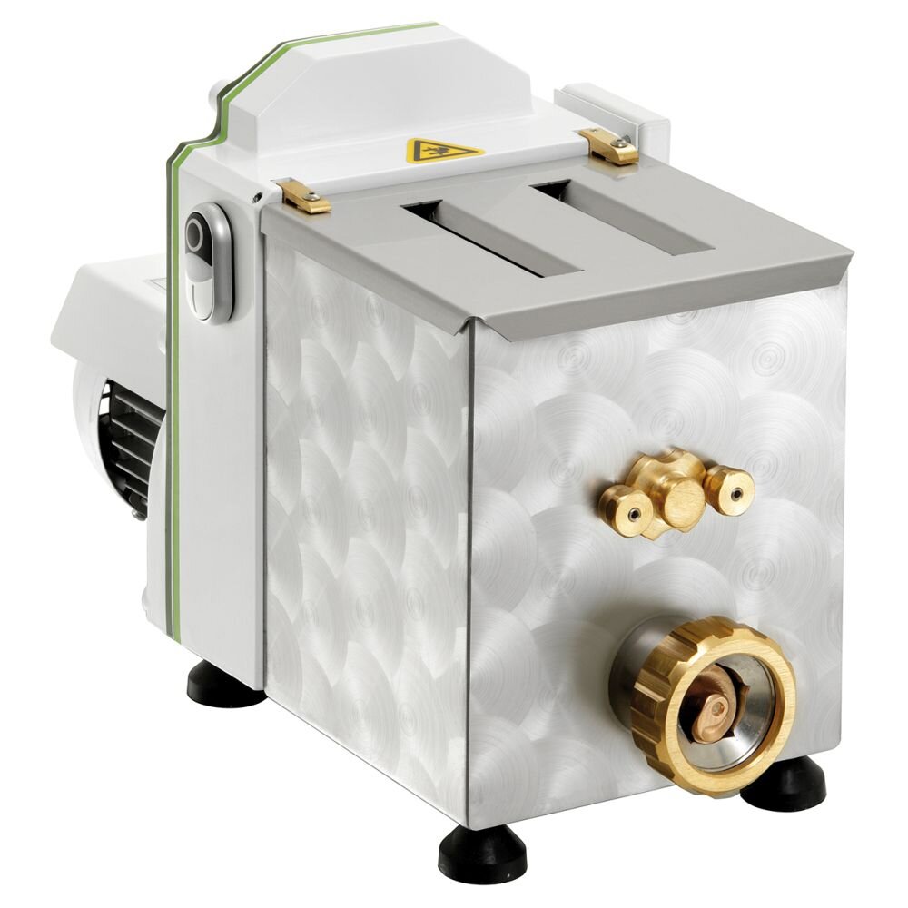 Pastamaschine 1,5Kg Zum Kneten und Ausrollen von 12 verschiedenen Pastasorten Material: Gehäuse mit kratzfestem Lack beschichtet Behälter und Knethaken aus CNS 18/10 Schraube aus Messing mit Bronzelegierung Mikroschalter am Behälterdeckel Fassungsvermögen: 1,5 kg Produktion: max. 3 kg/h Anschlusswert: 0,3 kW / 230 V 50 Hz Maße: B 250 x T 480 x H 460 mm Matrizen für Pasta und Verschlusskappe sind im Lieferumfang nicht enthalten