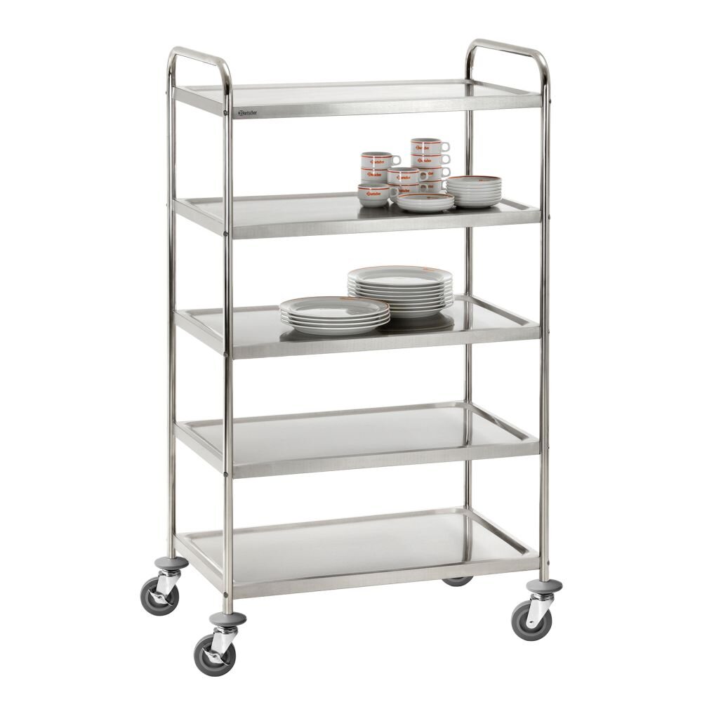 Servier- / Transportwagen TS 500 Servier-/Transportwagen TS 500 mit 5 Borden Robust und vielseitig: ob für den Transport im Gastronomie-Bereich oder für z. B. die Wäscheausgabe in Hotels, etc. Mit seinen 5 Borden bietet der Servierwagen extrem viel Stau- und Ablagefläche. Chromnickelstahl 4 Lenkrollen mit 2 Feststellern Tragfähigkeit: 100 kg Maße: B 920 x T 600 x H 1540 mm Bordmaße: ca. B 827 x T 510 mm Lichtes Maß zwischen den Borden 265 mm (Bausatz, einfache Montage)