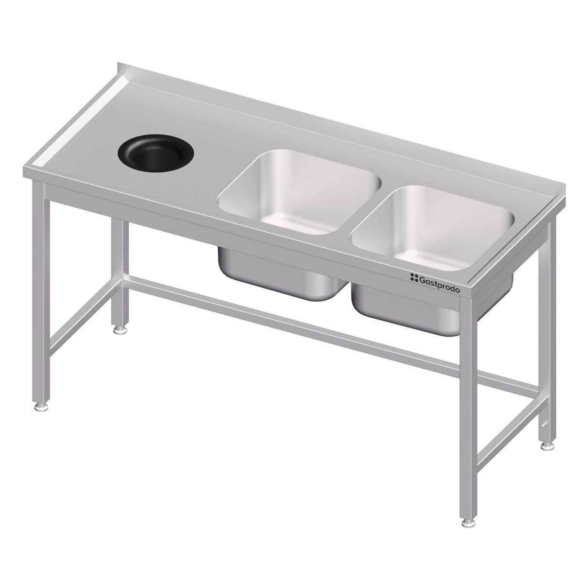 Edelstahl Spültisch ohne Grundboden mit Abfallloch, 1500 x 600 x 850 mm, mit zwei Becken rechts, mit Aufkantung, verschweißtSpültisch ohne Grundboden & 2 Becken + Abfallloch hergestellt aus rostfreiem, ferritischem Stahl Aufkantung hinten, 40 mm Höhe Plattenstärke mindestens 1,2 mm, Beckenstärke 1 mm umlaufender Wulstrand, 19 mm Abtropffläche mit Omegaprofilen verstärkt höhenverstellbare Füße +25 mm bis -4 mm Tischbeine aus Vierkantprofil 40×40 mm, Materialstärke: 1,2 mm Lieferung inkl. Überlaufrohren in 180 mm Länge und Abflusssiebe mit Becken links oder rechts Beckenmaß 400 x 400 x 250 mm bei Tischen mit T = 600 mm Beckenmaß 400 x 500 x 250 mm bei Tischen mit T = 700 mm & B ? 1500 mm Beckenmaß 500 x 500 x 250 mm bei Tischen mit T = 700 mm & B > 1500mm fest verschweißte Ausführung mit Abfallschacht Innendurchmesser der Öffnung: 140 mm, mit entnehmbarem Gummiring