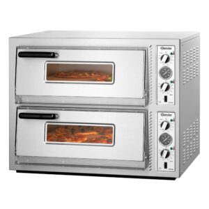 GMG Pizzaofen CLASSIC PF 5050 E 4 Pizzen Ø 25 cm Technische Eigenschaften: Backdeck aus hochwertigem und feuerbeständigem Schamottstein Aussenverkleidung frontseitig aus Edelstahl Gehäuse Stahlblech lackiert Wärmeisolierter Türgriff Extra große Sichtfenster mit hitzebeständigem Sicherheitsglas Innenbeleuchtung für jede Backkammer einzeln schaltbar Thermostatische Temperaturregelung getrennt für Ober- und Unterhitze Betriebskontrolleuchte Entlüftung der Kochdämpfe über integrierten Kamin Innenisolierung aus hochwertiger Steinwolle Geringer Energieverbrauch Gerätedaten: Abmessungen (B/T/H): 80 x 73 (86) x 36 cm Backkammer (B/T/H): 51 x 51 x 10 cm Kapazität: 4 Pizzen Ø 25 cm Temperaturbereich: 85° – 455° C Leistung: 4 kW , 3 NAC, 400 V Gewicht: 56 kg