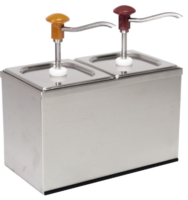 GN-Edelstahl- Pumpspender für Soßen 2 fach Behälter aus Edelstahl (GN1/6) 2 Behälter je 3 Liter Dosierung einstellbar (30ml) benutzerfreundlich und hygienisch Maße: 340 x 185 x 345 mm (BxTxH)