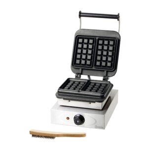 Gastro Waffeleisen Klassisch – 5 x 3 – 2 Stück – 100 x 25 x 164 mm (je Waffel) Die Waffeleisen von Maxima sind in verschiedenen Größen und Formen erhältlich. Die rechteckige Form eignet sich hervorragend für Brüsseler Waffeln. Diese Maschinen verfügen über ein leistungsstarkes Heizelement, das die Form schnell erwärmen und warm halten kann. Mini-Pfannkuchen, Herz oder klassisch geformte Waffeln sind möglich. Hochleistungs-Catering-Waffeleisen Erhältlich als Einzel- und Doppelmodell Die klassische Form ist ideal für Brüsseler Waffeln Erhältlich mit Herzform oder klassischem Waffelmuster Thermostatische Temperaturregelung von 50 – 300 °C Gusseisen-Backblech mit Antihaftbeschichtung Backen Sie einfach 4 Waffeln gleichzeitig Abmessungen Gusseisen-Backblech: B214 x T164 mm Waffelgröße: B100 x T164 mm Edelstahlgehäuse Leicht zu reinigende Oberfläche Nettogewicht: 18 kg Abmessungen: B630 x T380 x H270 mm 230 V / 50 Hz / 1 Phase 3200 Watt