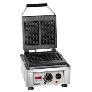 Waffeleisen Mini Belgische Waffeln – 10 Stück – 55 x 12 x 82 mm (je Waffel) – mit Timer Mit dem Mini-Waffeleisen können Sie einfach und schnell 10 Brüsseler Mini-Waffeln backen. Das Waffeleisen ist von hoher Qualität und für den professionellen Einsatz in der Gastronomie und in alten niederländischen Konditoreien geeignet. Das Mini-Waffeleisen hat eine Aluminium Backblech mit einer Antihaftbeschichtung. Die Außenseite besteht aus Edelstahl und ist leicht zu reinigen. Das Mini-Waffeleisen verfügt über ein leistungsstarkes Heizelement, das die Form schnell erwärmt und sie leicht warm gehalten werden kann. Eigenschaften für das Mini-Waffeleisen Robust und einfach zu bedienen Schnelle Produktion von 10 Mini-Waffeln gleichzeitig Aluminium Backblech mit Antihaftbeschichtung Variabler Thermostat 50 °C bis 300 °C Ausgestattet mit einem Timer Temperaturanzeigelampe Robuster Griff Ausgestattet mit Tropfschale Steht auf 4 Edelstahlfüßen Sehr langlebige Konstruktion Hygienisches Design Produktspezifikationen Nettogewicht: 11 kg Abmessungen Waffel: B55 x T82 x H12 mm Geräteabmessungen: B380 x T310 x H270 mm Elektrische Gesamtleistung: 1,75 kW 230 V / 50 Hz / 1 Phase 1750 Watt