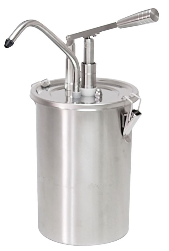 Zylindrischer Soßenspender 5 Liter aus Edelstahl mit Hebelbedienung Auslauf schwenkbar Dosierung einstellbar mit zylindrischem Behälter aus Edelstahl benutzerfreundlich und hygienisch inkl. Klammern Höhe: 420 mm Durchmesser: Ø 180 mm